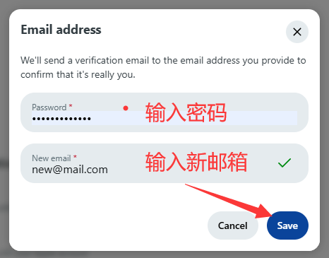 点击后如下面弹窗:在下面弹窗输入密码,在输入新邮箱 点击保存 Save